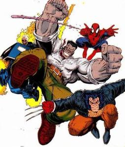 What’s more, all of these characters have already appeared in movies, so you can picture the actors who would play them. Just imagine the lovable nerdiness of Tobey Maguire (yeah, yeah, I know, someone else is playing him in the new movie; I don’t care), the majestic jellybean-swigging insanity of Nicholas Cage, the prickly clawed-ness of Hugh Jackman, and the… well, whatever of whoever’s playing the Hulk this week… all together! Chemistry, people! We got chemistry!