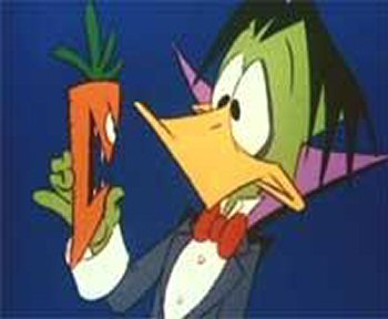 Meanwhile, in Transylvania, a different sort of night-lurking duck is about – a vampire duck. In his past incarnations he was as evil as they come, but he came back decidedly different following his last staking after ketchup was accidentally substituted for blood during the resurrection ritual. Now he’s a strict vegetarian, and merely wants a little adventure and a spot in the limelight. He is the one they call Duckula – Count Duckula!