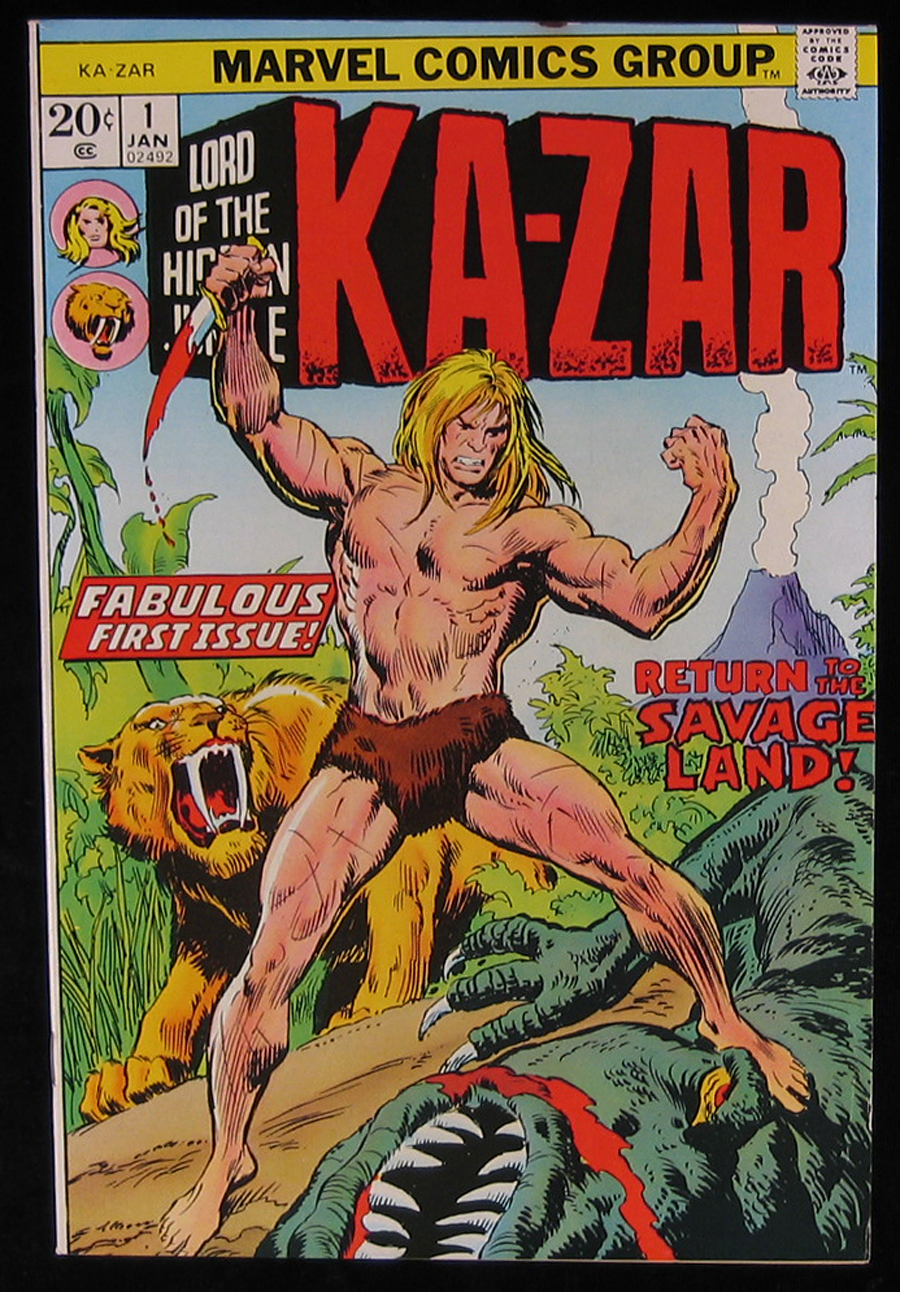 Who they are: On an expedition into the frozen wastes of Antarctica, the explorer Lord Robert Plunder, accompanied by his young son Kevin, discovered a cave that led into a huge subtropical valley – the Savage Land. Here dwelt many prehistoric species that had long since gone extinct in the rest of the world. Unfortunately, this also made it a very dangerous place, and Lord Plunder swiftly succumbed to some of the valley’s more lethal inhabitants. Left alone, Kevin might have died, except for the ministrations of Zabu, an unusually intelligent specimen of saber-toothed tiger who discovered the young boy and raised him as his own. Grown to maturity in the depths of the jungle, the heir to the house of Plunder has declared himself the unofficial protector of his adopted homeland from those who would despoil it. With the devoted Zabu fighting beside him, he is Ka-Zar, Lord of the Savage Land!