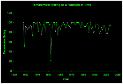 • So the average Tomatometer reading for a Best Picture winner since 1984 is 88% (I rounded up), with a standard deviation of 7, meaning 66% of the Best Picture movies will have Tomatometer readings between 81% and 95%. Amadeus is a 98%, with only Platoon beating it out. In the 20 years before, the average rating is a 96%, with a standard deviation of 4. It’s interesting that there are a lot more 100%s in those 20 years. Interesting enough that I looked up the Tomatometer ratings of ALL the Best Picture winners ever. Here’s the graph showing Tomatometer Rating as a function of time: