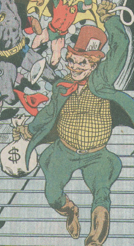 How to meld the two together? Simple – make the Hatter a different personality from Jervis Tetch. (Or, if you prefer, a persona he dips into which starts to meld with his own.) Furthermore, make his assumed character more like the Hatter from the book, who generally says exactly what he wants to and doesn’t give a toss about other people’s reactions – appropriate for someone looking for a defense against his own shyness. This also gives him a reason for the hat fixation, along with a general outline for his scheme – have him be a literal hatter. He could run a high-class haberdashery that sells hats to Gotham’s elite, in the hatbands of which, of course, are his mind-control gizmos. As Jervis Tetch, he’s a quiet, meek little guy pottering about among his hats; as the Mad Hatter, he’s a huge ham with the ability to make the city dance to his will via hat-control of the people who make it work – and the more it does, the more it starts to take on a vaguely Wonderland-ish air. His primary motivation? As with his Pre-Crisis counterpart, he wants Batman’s cowl – because that way he can fit it with mind-control bugs, too, and turn the only guy who could stop him into an unbeatable enforcer!