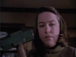 Paul is one of those sissies who gets paid to write, a novelist responsible for the popular “Misery” romances. (A cheerful series, one presumes.) Dissatisfied with his oeuvre, he’s seemingly freed himself by killing off his main character (please, Paul, that didn’t work for Arthur Conan Doyle, why should you get away with it?), and has just completed the first book he’s actually proud of. But when his car overturns on his way to deliver the manuscript, badly enough that it just might be published posthumously, Paul is rescued and nursed back to health by his biggest admirer, Annie Wilkes. And oh, she just loves the Misery books soooo much! Unfortunately, in addition to poor taste in fiction, Annie is perhaps not quite all there; so when she learns that her favorite character of all time is no longer with us… well, the bedridden Paul may be in for a firsthand lesson on how writers suffer for their art.