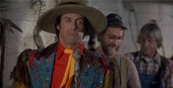 Dolly Parton stars as Jake, a country singer from Tennessee that’s come to the big city of New York. She’s found her start at a country western themed nightclub called The Rhinestone. While she has a bigwig interested in giving her a record deal, unfortunately she’s still tied, exclusively, to two more years at the club by a contract with sleazy owner Freddie. Jake tells him she can turn anybody into a country success. So the two make a bet: She has two weeks to take someone of Freddie’s picking and train him to sing one song without being booed off the stage (Rhinestone’s urban cowboy clientele are notoriously harsh). If she wins he let’s her out of her contract, if he wins he tacks on five more years and Jake has to sleep with him. Enter Nick (Sylvester Stallone), a not-so-sharp New York cab driver. After some arguing and hijinks Jake convinces Nick to enter into the scheme. Off they go to Jake’s hometown so she can teach him to eat, sleep, and breathe country, so he can sing country.