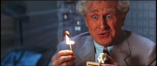 • The company logo appears frequently, each time representing a path to destruction: the path leading up to the factory, the product that the company makes (a rectal probe), the bolt of lightning which sinks the ship, the path up the side of the mountain, the lava flow down the side of the volcano, the crack in Joe’s apartment, and a constellation.