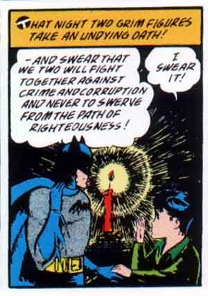 darkness and fear – but this is largely because it was lonely, because he has walked it with only the faithful Alfred by his side. He sees young Dick starting along this road, and he wants to help him. Yes, Grayson must avenge his parents’ deaths; he is driven by the same engines that drive the Batman, but not in the same way. He will have a mentor, a father figure, a companion, a big brother, a teacher – and as such, the pain of loss will not be the constant presence that it is for Bruce Wayne. The man of dark midnights is joined by a boy who can smile.