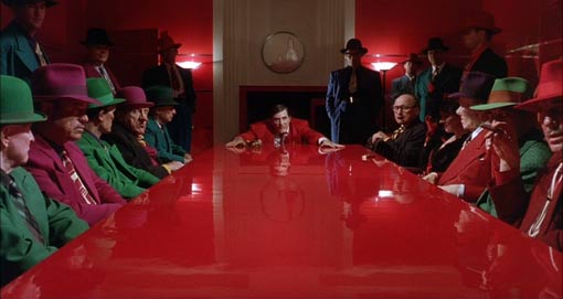jack_nicholson_1989_01_01The interesting thing about this period is that, while its films are very much influenced by the previous decades’ style, they are also very determinedly exploring new ground. Batman was – and I believe this has been stated, although I can’t locate the exact quote – a conscious attempt to break free of the campy atmosphere that was then still overwhelmingly associated with comics and comic book film. Certainly it and its first sequel are much, much darker in tone and overall feel that any superhero spin-off media had been up to that point. At the samedick-tracy-boardroom_510 time, however, Burton’s vision for the two films is basically the camp stylings held up to a funhouse mirror – where they are bright and colorful, his is dark and brooding, but both approaches veer into visual spectacularities that have less to do with realism than with capturing the feel of a comic book. Therefore, all the subsequent movies trying to piggyback off their success were really still very much influenced by the previous era – just an evolved version of it with a bit of a different identity.