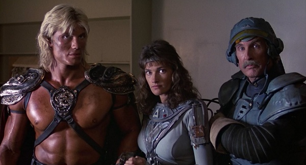 We begin on the planet of Eternia — no one ever accused the He-Man cartoon series creators of wasting more than a fraction of a second on names — where Skeletor (Darth Vader) has beaten down the remaining freed people (the Rebel Alliance) and has now taken wing in his massive fortress of doom, Castle Greyskull (the Death Star). For reasons unknown, He-Man and his pals want the castle back, even though the words “Skeletor” and “Greyskull” go together like bologna and mayonnaise. It was just meant to be, people. Our pal Skelly has a face only a corpse could love, but that doesn’t hold a candle to the outfits of the good guys: He-Man as an over-oiled, caped, minimal-wearing Dolph Lundgren, spandex-and-headband-sporting Teela (Chelsea Field), and action figure-ready Man-At-Arms (a moustachioed Jon Cypher).