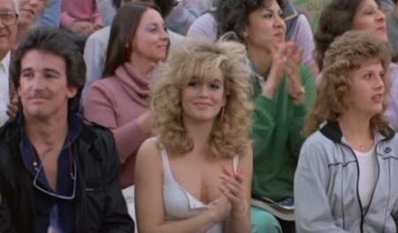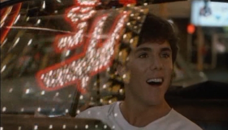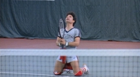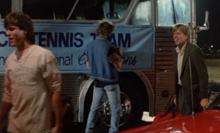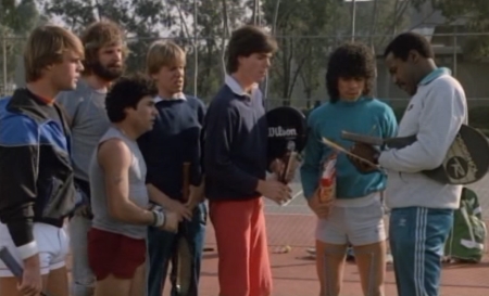 Oh, and there’s some screw-up star player that they call “The Kid.” Billy ain’t happy. The Kid (Scott Strader, who played Karate Kid’s Eddie) is such a rebel that he doesn’t even wear a seatbelt or sit in the car the correct way. I know we’re going to be just the best of movie friends. He also sports a horrible outfit that includes a collar-less sweatshirt and a tiny pair of shorts over what appears to be boxers. At least his dress keeps me occupied through the action-packed tennis practice, during which the director keeps abruptly cutting between the two hitting (or not) the ball and The Kid’s girlfriend cheering him on.
