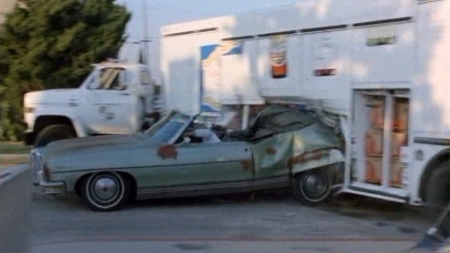 He’s not wearing a seatbelt, by the way, and hits this truck in full view of cops. This will be fun to watch the movie hand-wave away.