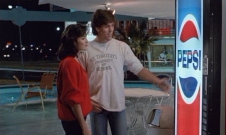 It doesn’t take long before The Kid has his meet-cute with Nicole in front of a Pepsi machine. Man, that logo has not changed much in the past 30 years, has it? Nicole karate kicks the machine, which is mixed product placement if I ever saw it.