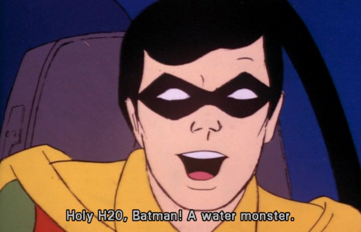 This screencap genuinely makes me laugh every time I look at it. Robin is likely going to die in about two seconds, but he’s so deeply thrilled that there’s a 100-story water monster popping out of nowhere that he doesn’t care about his own life. I can only speculate that Batman uses those remaining two seconds to reach back in the cockpit and throttle Robin for this.