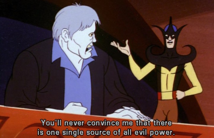 Our episode opens with the Legion of Doom sitting around and having a philosophical discussion, as all villain groups tend to do between heists. The topic of the day: Is there a single source of all evil power?