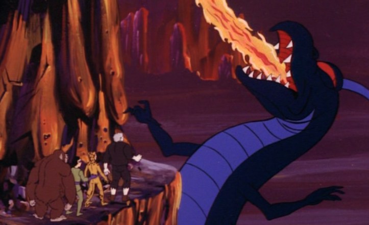 And without a pause for a group vote or any pertinent follow-up questions, Grundy yanks on a lever and takes the Hall of Doom down to the bottom of the swamp and then into the earth’s crust itself. Really, I don’t see the hurry, but at least this show doesn’t drag its feet before getting to the insane plot. And if you ever wanted to know what the center of the world looked like, basically it’s a classic version of Hell with fires and molten pits and a bunch of angry cosplayers. Also, there’s a really grumpy fire-breathing dragon.