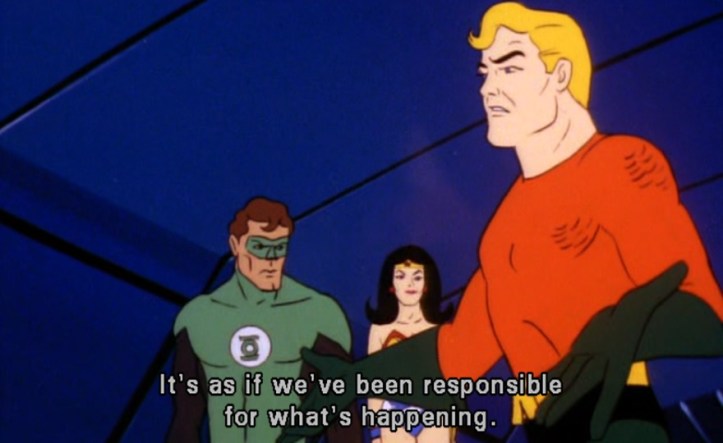 Has there ever been such a group of useless dorks as the Superfriends? Literally inside the same bubble is Superman, Batman, Wonder Woman, Green Lantern, Flash, fish guy, bat sidekick, spinny guy, and HAWKMAN — and nobody can pop this thing and save the world?
