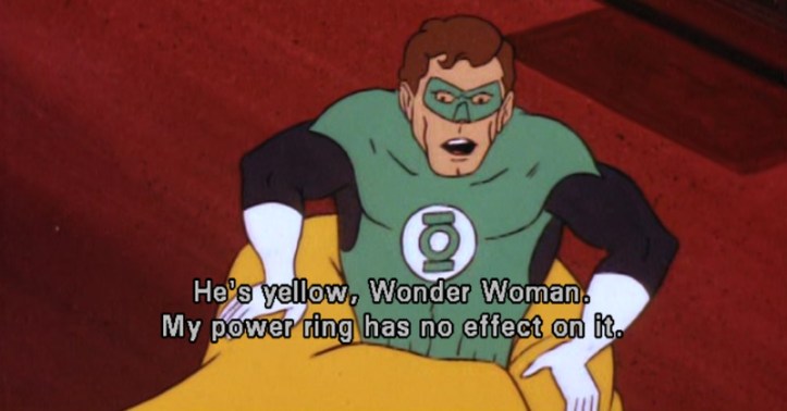 I have to imagine that Green Lantern uses this line whenever he sees anything in the world that’s golden. “That Twinkie is yellow, Batman! My power ring has no effect on it!” I think he’s contractually obligated to scream out his weakness every time he’s confronted with it, on the off-chance that his co-workers happened to forget since the last time he saw something yellow.