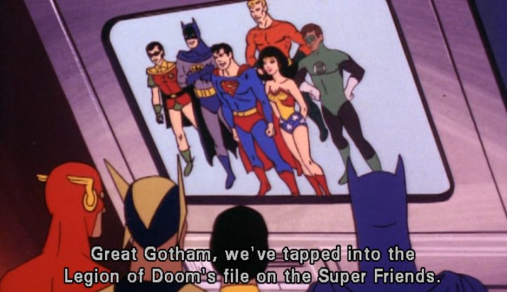 Flash does his “my vibrating molecules can do anything” trick and walks through a dungeon wall to free the rest of the crew. There in the computer room, they discover that the Legion of Doom never deletes its browsing history — and they spy these now-unfamiliar Superfriends who still exist in this recording even though this is now a different timeline. The Superfriends decide on a mission to set history right by going back to prevent the Legion from messing with the three heroes.