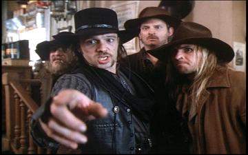 Cut to marshal Brisco County (played by R. Lee “Let me see your war face!” Ermey) on a train. Him and his men have just finished rounding up a notorious band of outlaws known as the Bly Gang, thirteen cutthroats including boss John Bly (‘90s badguy Billy Drago). Going all Wile E. Coyote, a couple of the gangs toadies use a scenic painting on a boulder to derail the train. Brisco County Sr. ends up taking (at least) thirteen bullets.