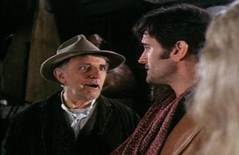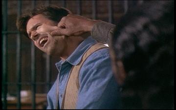 Brisco sneaks back into town and gets Puel to tell him where Bly is. Brisco tells Bly he wants to shoot him, but instead will bring him in alive. Bly taunts him, “You mark your accomplishments by walking in the shadow of your father, but how far have you progressed?” Let me say, Billy Drago, even though Bruce claims he’s actually a great guy in the commentary, plays crazy real good. They agree to a fair hand to hand fight, but are interrupted by Donovan using Coles as a hostage.