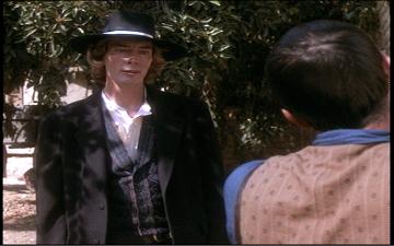 Investigating the scenic painting angle, Brisco and Socrates head on down to a saloon. Several characters are introduced: Big Smith’s girlfriend and sexy singer Dixie Cousins (Kelly Rutherford), fellow future seeker and kindred spirit Prof. Albert Wickwire (Sean Astin), and the Professor’s tomboy daughter Amanda. Brisco decides to follow Dixie, joining her on a stagecoach.