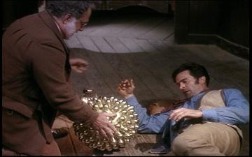 Bly tells Coles that he’ll shoot Brisco if he doesn’t tell him where the Orb is. The old man tells him it’s it the back of his wagon. Bly thanks him and shoots Brisco in the stomach with his father’s gun.