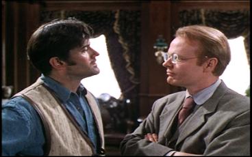 In an exposition scene with a journalist, we find out that a group of robber barons, (all played by classic actors from movie and TV westerns) building up San Francisco during its infancy in 1893, are afraid the gang’s escape might crimp their business style. So they decide to hire a bounty hunter, not obvious choice Lord Bowler, but Brisco County Jr., a Harvard man who decided not to be lawyer after studying for seven years. After a not so heroic introduction to the audience, and a not much better introduction to the barons, Brisco establishes a disgust/grudging respect relationship with go-between stick in the mud lawyer Socrates Poole (Christian Clemenson).