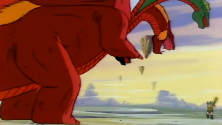 Lost and without any clear guidance as to how to get home, the group engages in some fun echo shouting over a fantasy grand canyon. Now every kids show in the ’80s had some sort of adorable little mascot, and D&D’s was Uni the baby unicorn. I know unicorns don’t wear clothes, but the look and color of this one really suggests that its very naked. Their shouting summons the five-headed dragon Tiamat, who was apparently napping (?) in a nearby cave.