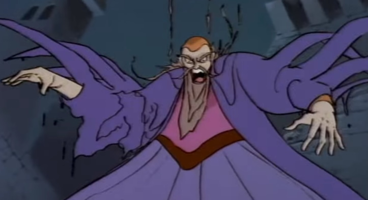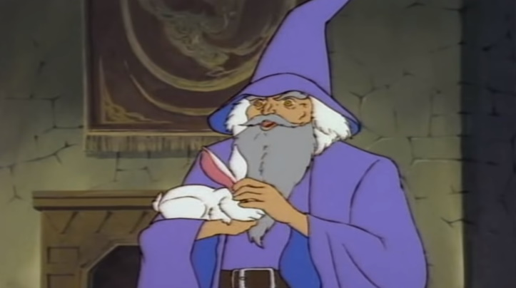 Finally the group sort of gives Tiamat the slip and traps him back in the cave, while the Dungeon Master reappears. That’s his actual name: Dungeon Master. The kids ask him point-blank how to get home, but he’s all Yoda-like and says, “Patience! Your presence here has a purpose!” Which is, according to many police reports I’ve read, what you do not say to children that you abscond with across state lines. Instead of helping them, he up and sends them north to some random village and tells them to beware of a white-haired wizard. Then he disappears, because what kids need escorts in this land of murder-lizards?