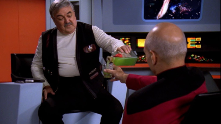 While Picard acts more like a pompous dill pickle than usual (it’s a gas when he’s chewing into Wesley, who’s all about invading Picard’s private space), there’s enough fun to be found here. I always love the pilot episodes of seasons, mostly because they’re so busy trying to cram in tons of introductions, facts, settings and stories that you aren’t left with much time to complain if the episode is actually good or not. Within the first few minutes, we get a completely unnecessary saucer separation, a look at the battle bridge, a visit from Q, and loads of goofy looks from Troi and Yar (who both look like heavily made up guppies). Later on, we’re treated with a pointless yet thrilling cameo from “Admiral” McCoy, who’s just as grouchy as ever. “You treat her like a lady,” McCoy says about the Enterprise, “And she’ll always bring you home.”