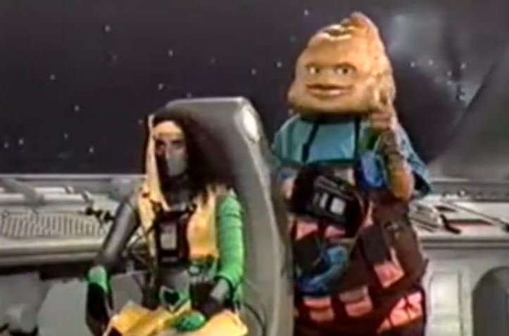 The spaceship computer, MOM, freezes time on Earth and beams Bhodi up to the ship while equipping him with lots of chunky foam padding. He poorly acts his way through astonishment while the series’ backstory is explained to him. According to this show, every planet in the universe is controlled by a substance called photon. If the good guys charge it (shoot a crystal), then that planet becomes good for 100 years, and if the bad guys charge it, it’s a century of darkness. So this is the way the show justifies turning all these planets into giant Photon arenas.