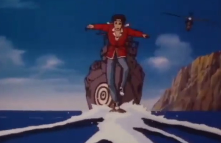 The opening theme is serviceable but kind of weird, as it’s a synth pop song laced with Japanese tones and people shouting “KA-RA-TE KID!” Also, Daniel-san is shown running on a torpedo during the intro, which I think might be a little outside the bounds of my belief.