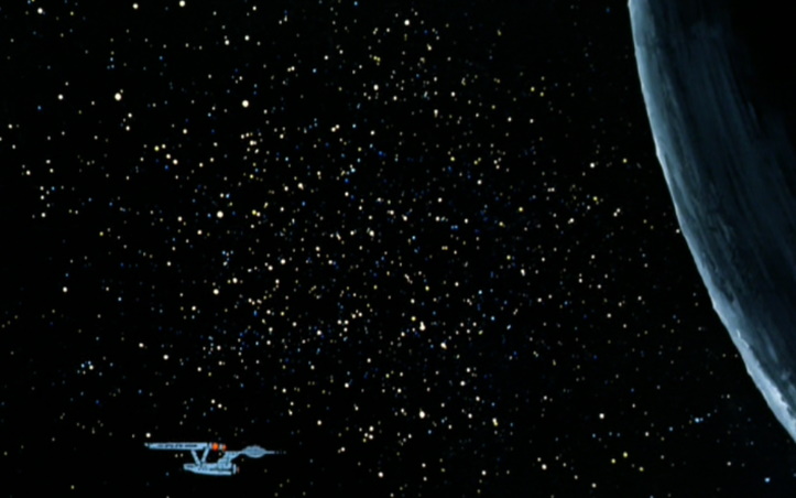 In all seriousness, I thought this scene was rather well-done. It’s suitably tense as the Enterprise can’t pull out of the “hypergravity” and instead attempts to go faster in order to attain orbital velocity. There’s a fantastic shot of the ship against the enormity of the planet that I posted up there.