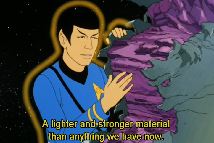 Spock, Kirk, Scotty, and McCoy beam onto the surface of the ship with life support belts — pretty handy, those — and there they discover that the pods look very much like what insects might make. Even the metal was “spun” rather than erected the normal way. Spock is really grooving on it, too: