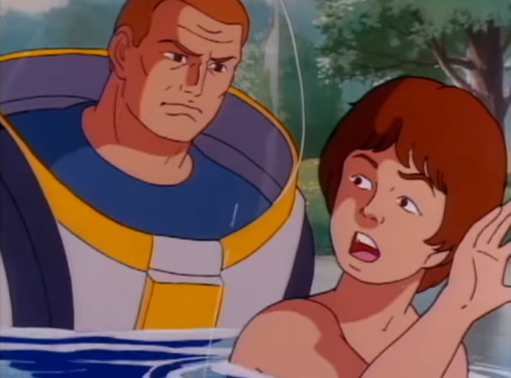 “Get out of the water, you moron,” Deep Six intones. He doesn’t like his “viewing material” dead, I suppose. Really, I’m kinda creeped out by this Joe here. What reason, at all, would someone wear a huge metal diving suit to go into a kids’ swimming hole and stay down there until just the right and opportune moment? How did he hear them from down below? And why is it so much safer for a guy wearing a giant lightning conductor to be in the water when it’s so dangerous for a kid to be?