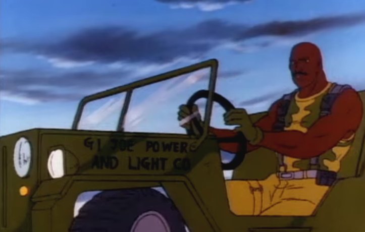 Before this stunt could become reality, a burly Joe pulls up in a jeep (they don’t say his name, I don’t remember it, and I’m not going to spend fifteen minutes looking it up). It’s not just any jeep, oh no, it’s the Official “G.I. Joe Power and Light Co.” jeep! You probably can’t read the wording in the picture there, but trust me, that’s what it says. So G.I. Joe, an organization devoted to fighting worldwide terrorism… has a power and light subsidiary? Why? Did they need the funds? Was this a government grant?