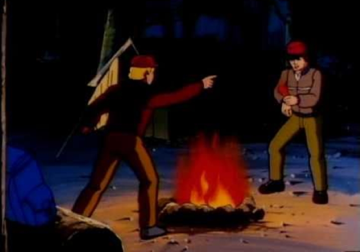 Two kids are deep in the woods at night, making camp all by themselves. Strangely enough, there’s no Joe called Babysitter who jumps out and chides them for being so foolish to think they could survive the night alone without parental supervision. One of the kids — a kid who looks faintly like Michael J. Fox — puts more wood on the fire. We’ve so far learned that fire in Joe PSAs are so ravenous for child flesh to char that it often migrates thousands of miles out of its way just to take down a youngster. Mikey here quickly discovers this, as an ember lands on his jacket sleeve and quite possibly the smallest flame known to mankind takes root there.