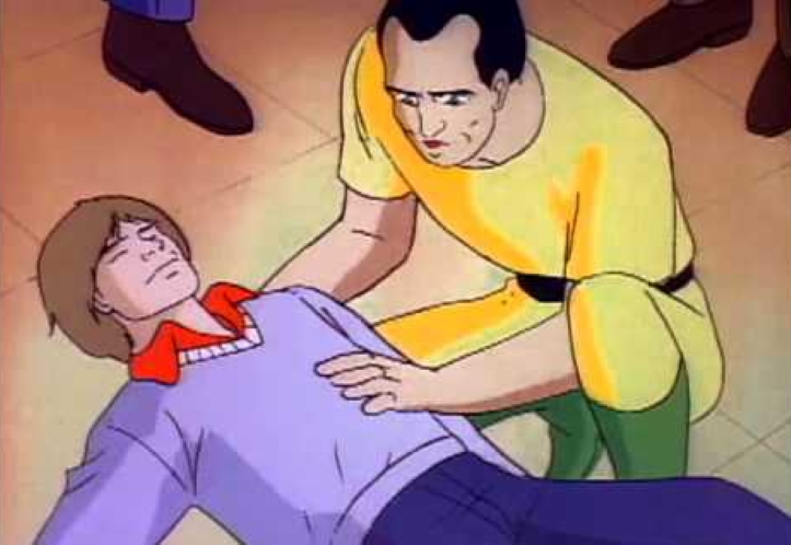 Oh, it’s Billy. Billy has a butterfly collar and a forehead full of mop sweat. For an unknown reason, Billy collapses on the hallway floor. His companion turns around with hands outstretched and pleads, “My friend passed out!” It’s only of passing oddity that he’s already saying this before Billy hits the ground, so I’m calling it a slight case of precognition.