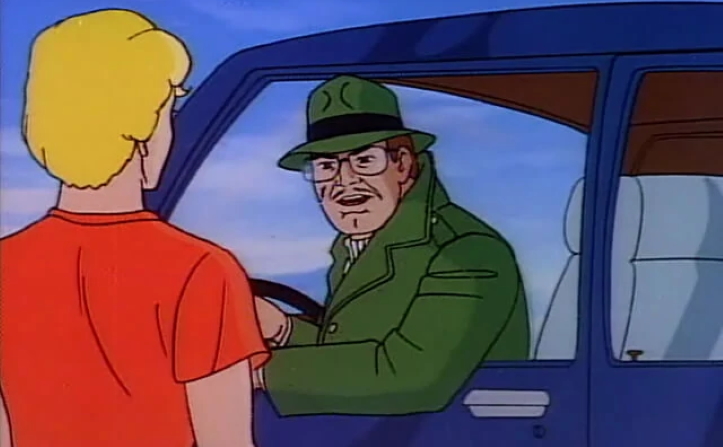Problem #1 for Stranger: He’s dressed as The Riddler, with green and blacks galore. This sheds new light on the old 60’s Batman show, I see now. Problem #2: Stranger has a shaky baiting line — particularly with the “uh’s” thrown in there. It’s like he hadn’t even rehearsed this scene beforehand; some Strangers like to wing things. Problem #3: He’s being tailed by a Joe who’s more of a stalker than he is.