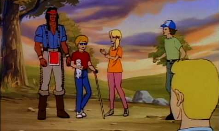 Mikey’s friend urges him to make a run for the stream. WRONG, idiot friend! DEAD WRONG! That wouldn’t allow our Joe of the Day, Spirit, his chance for action. Unlike many Joes who merely step out from wherever they’ve been playing hide-n-seek and offer words of sound(er) advice, Spirit the Native American comes barreling out of the dark, dark woods and grabs a huge blanket. Naturally, both of the kids quickly find the front of their pants stained with terror pee, a common response whenever strangers tend to dart out of the midnight woods with the apparent intention to kidnap them and feast upon their livers for dinner. “****!” they shriek. “HOLY **** GET AWAY YOU **********-***!!!”