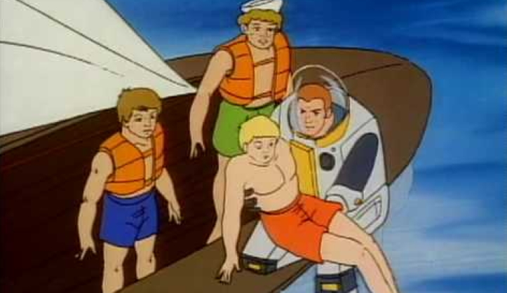 “Are you gonna wear THAT sissy thing?” one kid teases. We get a close-up of what the “sissy thing” is — it’s a boy’s life jacket, garishly orange and having the effect of making him look like he’s a minor He-Man action figure. Truthfully, it does look pretty sissy. I think he should take it off and just learn how to swim like the rest of us.