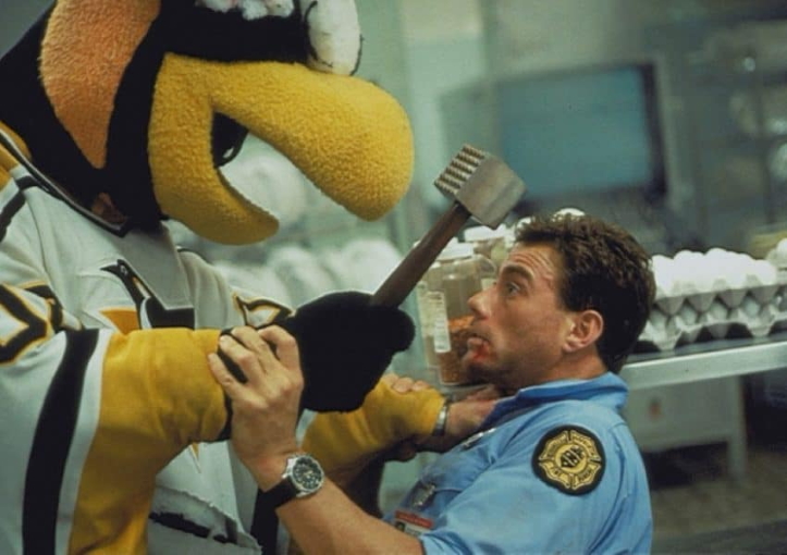 Justin’s review: Like most people, you would probably look at Sudden Death and assume that this was Jean-Claude Van Damme jumping on board the incredibly hot Die Hard bandwagon of the 1990s. It’s a common assumption, but I suspect that actual truth is that the screenwriters really wanted a movie where JCVD beat a Pittsburgh Penguins mascot to death and then reverse-engineered the plot from there.