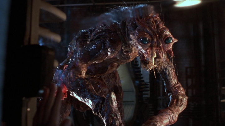 While the first half of The Fly II is somewhat dull and predictable – Stoltz never steals my heart with that feathered coif of his – this film gets to the good stuff a lot faster than its predecessor. Once Martin transforms into his true nature, we’re in for a rollicking good time. It’s sort of like Alien, except that here we hate everyone who’s under attack from the monster and wave around little “Go monster go!” pennants from our sofas. It’s also appropriately gross and “ewwwwwwwwwwwww,” the special effects and fly animatronics giving us a gore-fest (hint: flies aren’t all about hugs and cuddles as you might suspect).