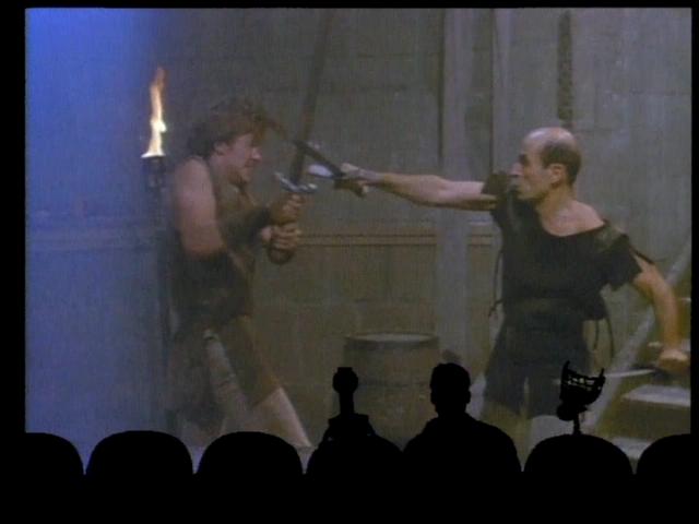 This movie has one of the more deceptive posters I’ve encountered. It looks a bit like something done by Boris Vallejo (for all I know, it is one of his works), with a well-muscled barbarian warrior clad in a loincloth and a lithe fighter chick in a chainmail bikini where the design of the top half serves more as a nipple cover than providing any support. There’s also a butch orc who looks very menacing. Needless to say, these people are nowhere to be seen in the movie. Our protagonist Deathstalker has a wirier build in the vein of Fritz Leiber’s Gray Mouser. Marinda is the closest thing to a warrior woman and is rather scruffy. While hardly an eyesore, neither is she the Playboy centerfold in the poster. Of course, there are no orcs, as the budget wouldn’t allow for it. The best we get are some undead warriors, so at least the title has some accuracy.