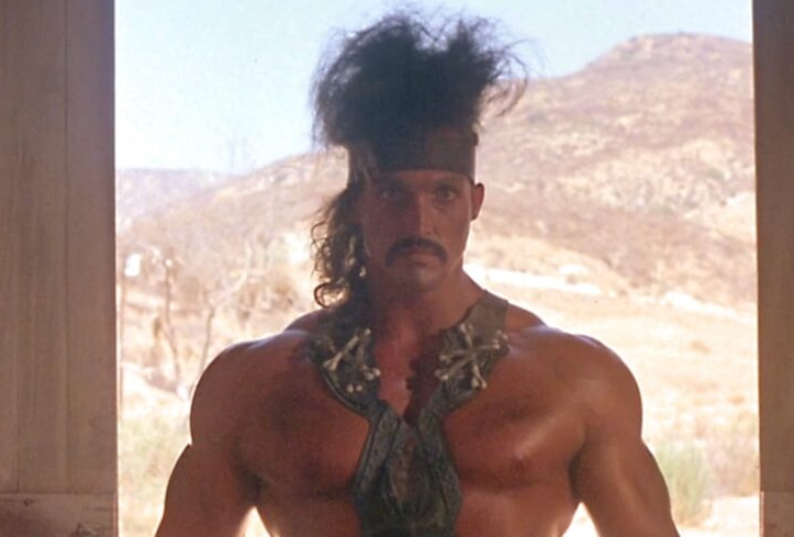 The super-evil intersex Velvet von Ragnar (KISS’ Gene Simmons in a deliriously odd performance) is planning on poisoning a city’s water supply for ransom. Hey, it’s the only way you can get jewels in this economy! To help in this task, Ragnar has a lifetime supply of feather boas, the full set of “How to Overact” VHS tapes, and an inexplicable post-apocalyptic warrior gang waiting to carry out orders to the letter.