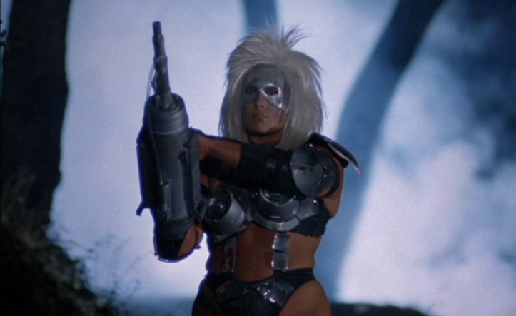 So let’s talk about the Alienator, because that’s the main draw (such as it is) for this film. She looks for all the world like a props department raided a Halloween USA on November 1st and slapped onto an actor whatever plastic molding they could find. In addition to weirdly suggestive body armor and an arm cannon, the Alienator wears the most groovy white spikey wig you’ll ever witness. The backstory I made up for this character is that she got teased so mercilessly in school for her hair that she elected for cyborg surgery so that she could take out his revenge on the universe.