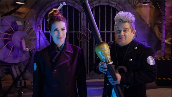Of the host segments, my personal favorite was the time portal safety drill. I’ve suffered through more than my fair share of workplace lectures which employ tortured acronyms to illustrate the point. This is also the first episode of the new series where they get visited by characters from the movie. The frequent cutting between the two sets of characters makes for a different rhythm than what we got with the conversations on the hexfield where such interactions usually occurred in the original series.