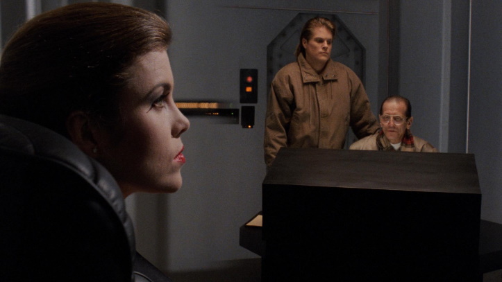 The crew of SPACECORE-1 isn’t going to cement themselves in pop culture history, but I’ve seen a lot worse from B-movies. Of particular note is the ship’s exposition android Leslie (who is dressed in form-fitting leather like she does lingerie ads in the off-season) and the ship designer, played by notable character actor Joe Turkel (Blade Runner, The Shining) in his final film role. Oddly enough, Turkel passed away in 2022. I won’t read too much into it.
