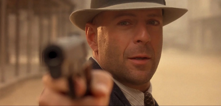 John Smith (Willis) gets his car roughed up by thugs while driving through the Texan town of Jericho. It’s a mostly dead town where Irish and Italian gangs vie for control, the local sheriff sits helpless, and the editor jacks up the sepia filter to maximum strength. Because it’s dusty, you see.