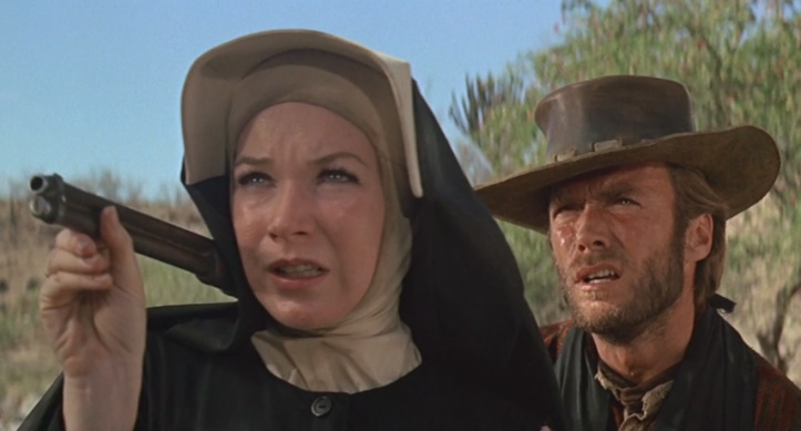 His swagger is brought to a standstill when he finds out she’s “Sister” Sara. Noticeably frustrated, he wants to know what a nun is doing out there. Sara reveals that she is running from the French, who are after her for helping the Mexican rebellion raise money. She was sneaking her way back to Chihuahua to assist the revolutionaries when the men… er… sidetracked her. Hogan is headed to the same place she is to help with the same cause, albeit for less noble reasons. The only money he cares about raising is for himself.
