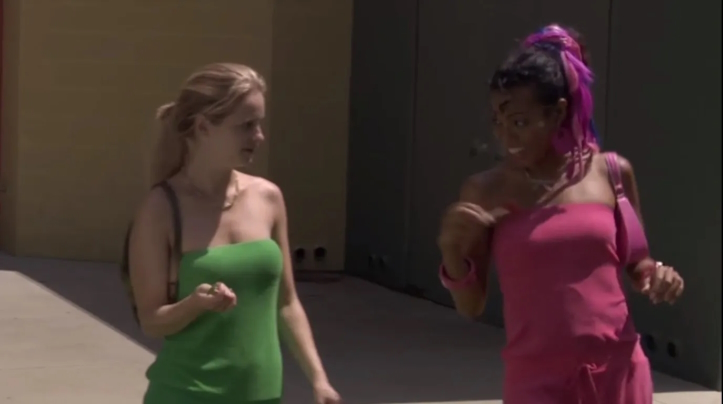 His grand quest promptly comes to a conclusion at the [checks] three-minute-30-second mark, as he discovers a girl named Lisa openly bemoaning her virginal state at the park. Lisa is best-known for her two defining characteristics: She has CGI acne, and she loves the color green. She wears about 40 different green outfits in this movie, including a green swimsuit and green underwear. Everything in her apartment is green. She drive a lime green VW bug. Her phone is green. Maybe she wanted to marry Kermit the Frog when she grew up? It’s never explained, so let’s just acknowledge that she’s the most desirable virgin in the whole world and move on.