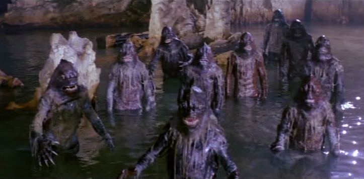 Look, I wanted to care. I really did. But the movie is astonishingly tedious and by-the-numbers. The Fish-Men are guys in rubber suits of course — but a full quarter-century AFTER Creature From The Black Lagoon, they still look like lightly smashed s**t, except in colour…. and tragically, that’s about the best the film can offer. The rest is mostly stock footage of volcanoes and some weirdly shot underwater stuff.